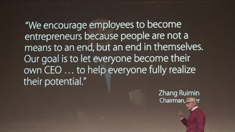 Professor Hamel said he was struck by Ruimin’s beliefs when they first met. “At the time, Zhang said: ‘We encourage employees to become entrepreneurs because people are not a means to an end but an end to themselves. Our goal is to let everyone become their own CEO.’”